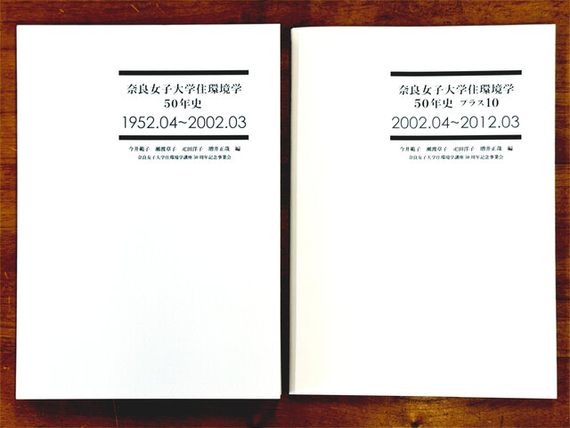1952年の創立から60年の歴史をまとめた『奈良女子大学住環境学50年史 1952.04~2002.03』全400頁と、『奈良女子大学住環境学50年史プラス10 2002.04~2012.03』全124頁が、2023年、二分冊として出版されています(今井範子 瀬渡章子 疋田洋子 増井正哉編、奈良女子大学住環境学講座50周年記念事業会発行)。