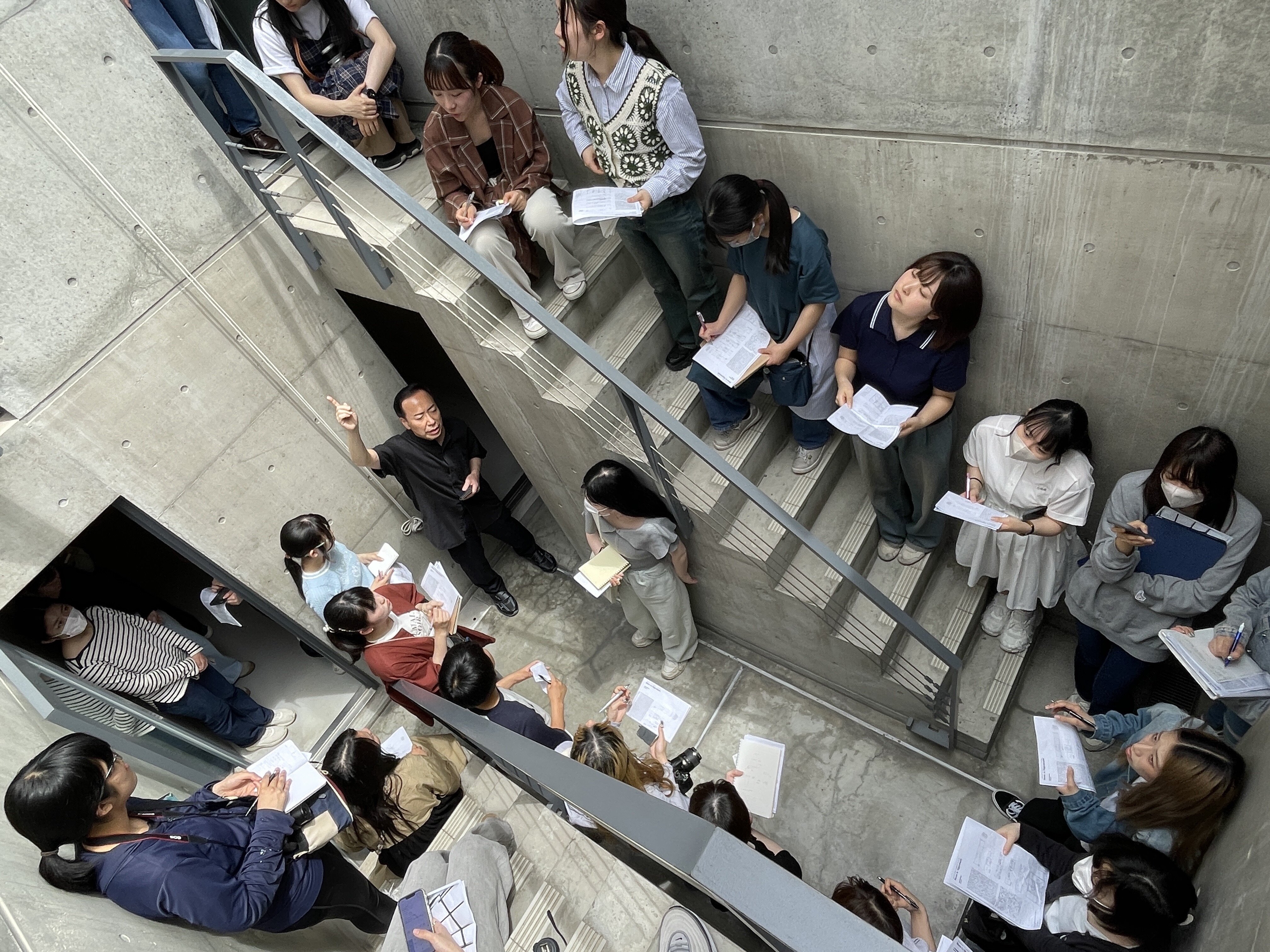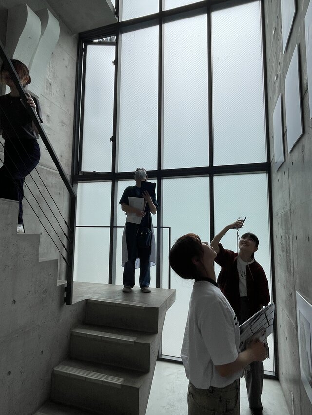 日本橋の家は間口2.9m、奥行15mの鰻の寝床のような敷地に建つ4階建ての都市型住宅です。現在は建築展を中心に行うギャラリーになっています。オーナーさんのご厚意により、ご案内いただきました。三層の吹抜けリビングや中庭を持つこの住宅は、シンプルな図面からは想像できないような、豊かな空間を持っています。講義で学んだことを実空間で肌で感じる体験をしました。